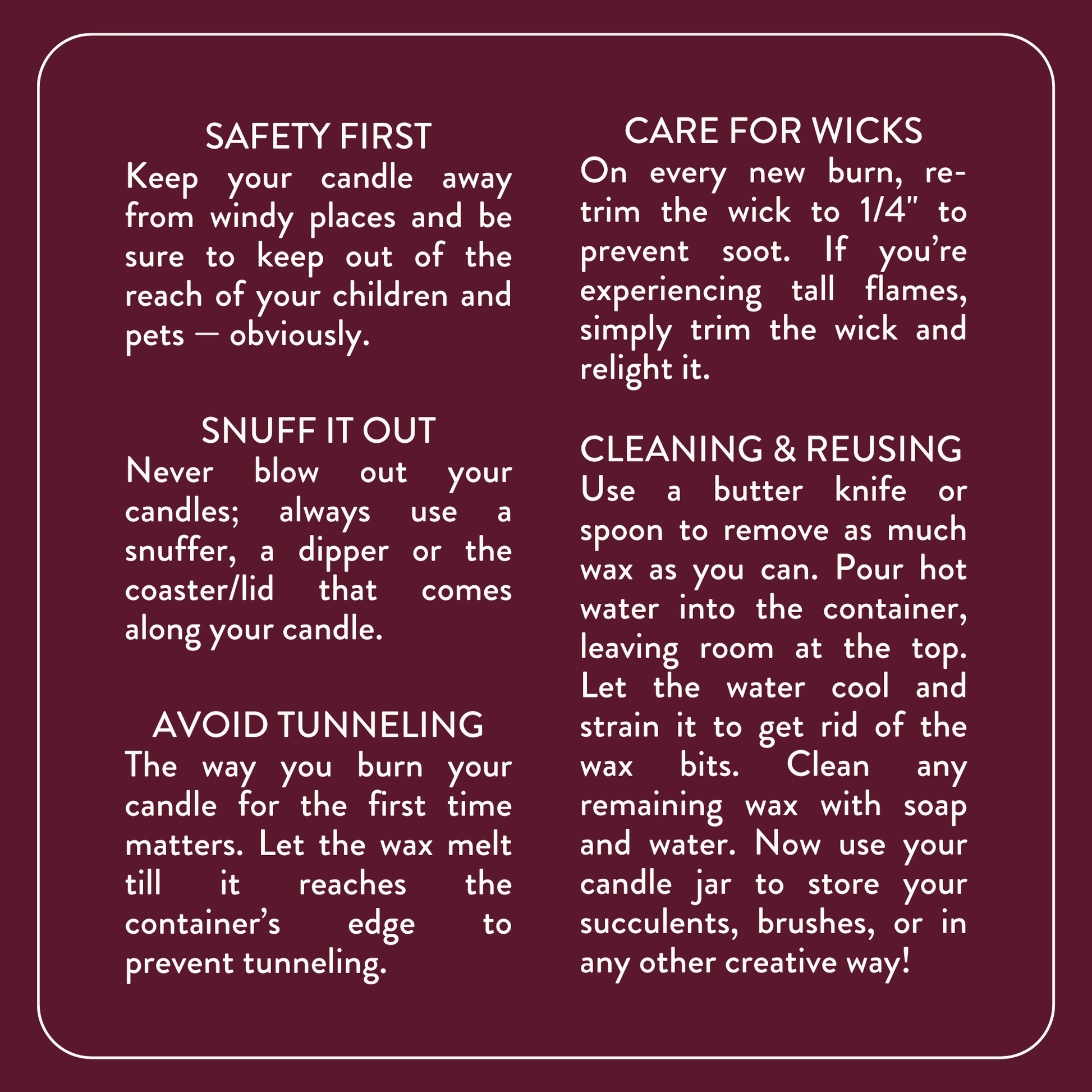 We don’t do buyer’s remorse, but if your candle arrives damaged or defective, we’ve got you. Check out our Return & Exchange Policy [here] for details.
