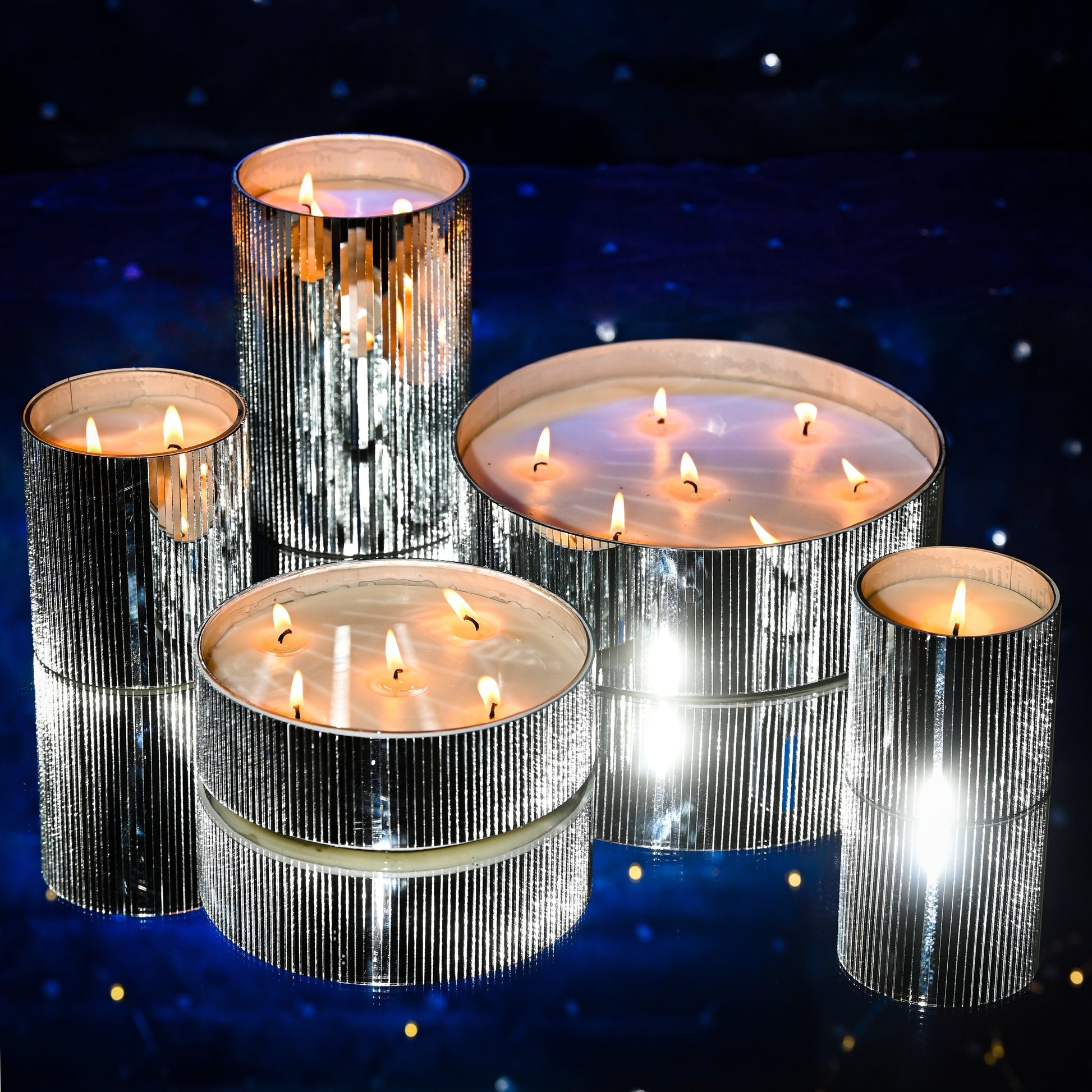 An ode to enchanting evenings, these candles radiate a captivating glow while exuding meticulously crafted fragrances—each chosen to evoke a unique mood. Encased in dazzling jars adorned with intricate mirrored mosaic handwork, these double & triple-wick candles are designed to dazzle, creating an atmosphere of refined elegance and charm.